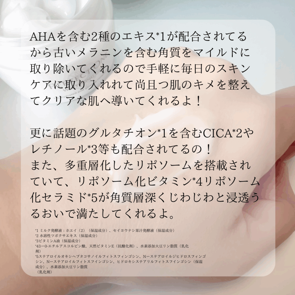 さらに、古いメラニンが含まれる角質を優しい使い心地でケアしてくれるAHAを含む2種類のエキス*2も配合されてるから毎日のスキンケアに取り入れられて手軽に古い角質ケアが出来ちゃうとのこと。